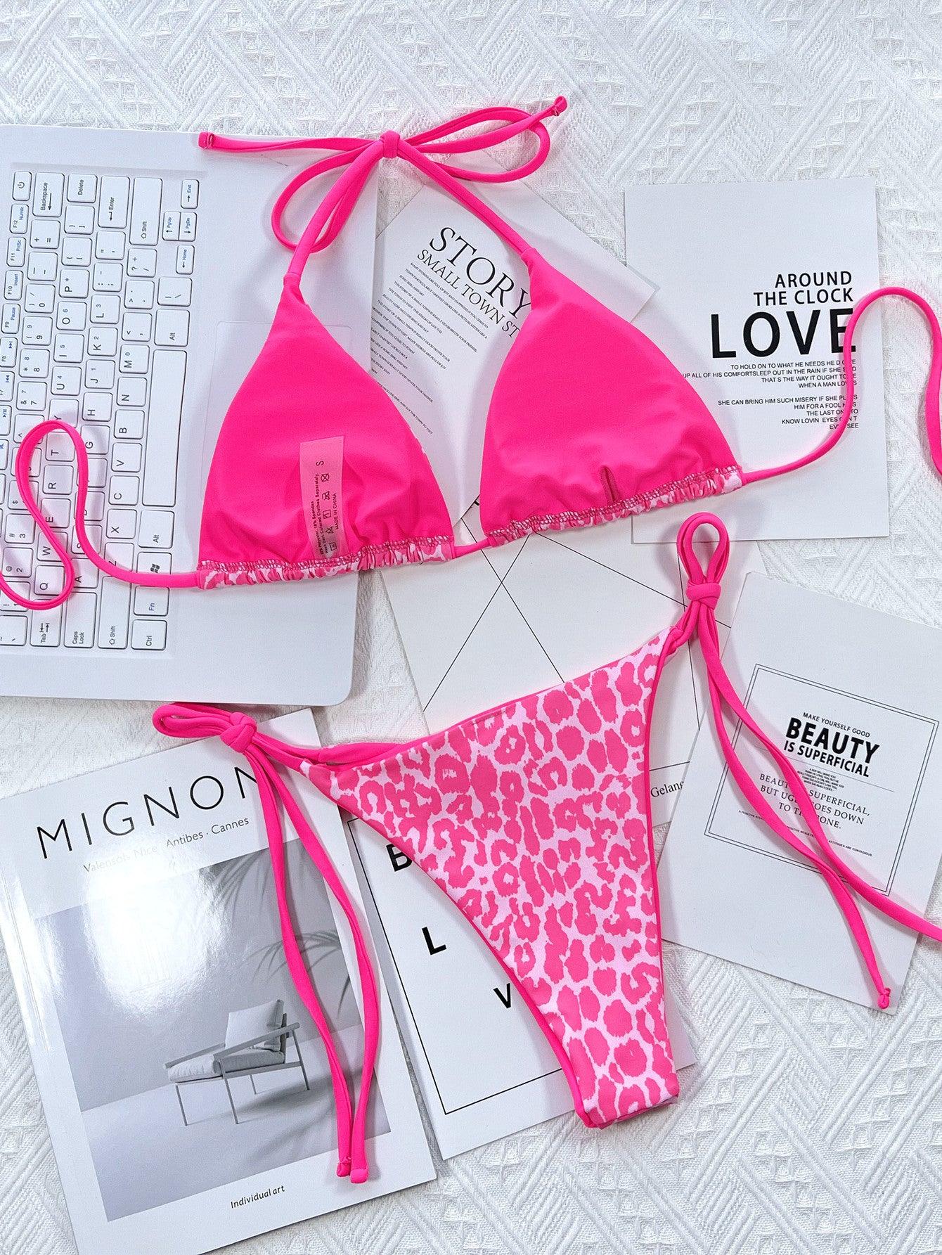 Leopard Print Halter Neck Tie Side Bikini Set