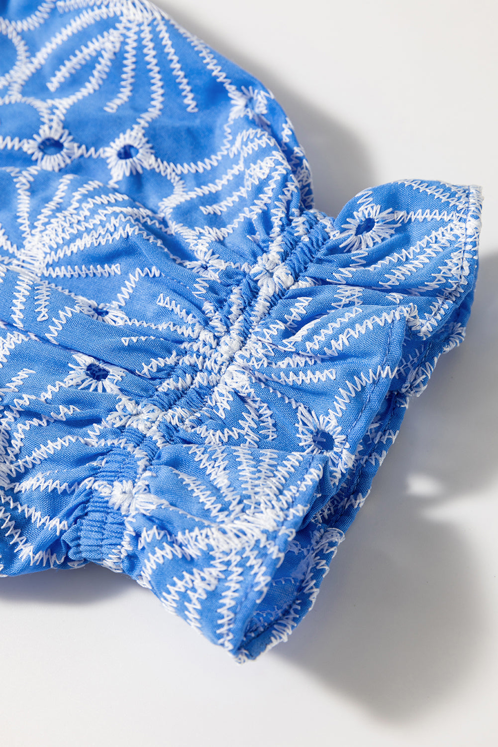 Sky Blue Eyelet Flower Embroidery Frilled Short Puff Sleeve Blouse
